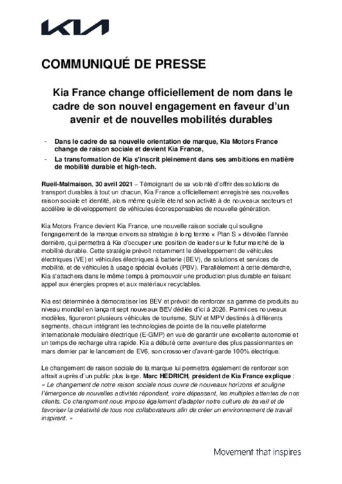 Témoignant de sa volonté d’offrir des solutions de transport durables à tout un chacun, Kia France a officiellement enregistré ses nouvelles raison sociale et identité, alors même qu’elle étend son activité à de nouveaux secteurs et accélère le développement de véhicules écoresponsables de nouvelle génération.