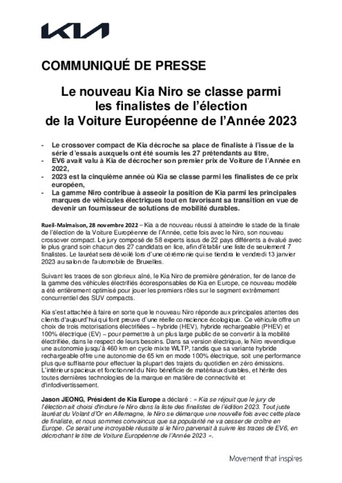 Kia a de nouveau réussi à atteindre le stade de la finale de l’élection de la Voiture Européenne de l’Année, cette fois avec le Niro, son nouveau crossover compact. Le jury composé de 58 experts issus de 22 pays différents a évalué avec le plus grand soin chacun des 27 candidats en lice, afin d’établir une liste de seulement 7 finalistes. Le lauréat sera dévoilé lors d’une cérémonie qui se tiendra le vendredi 13 janvier 2023 au salon de l’automobile de Bruxelles.