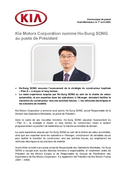 Kia Motors Corporation a annoncé avoir promu Ho-Sung SONG, actuel Responsable de la Division des Opérations Mondiales, au poste de Président. Dans le cadre de ses nouvelles fonctions, Ho-Sung SONG assurera l’avancement du ' Plan S ", la stratégie à moyen et long termes du constructeur visant à asseoir progressivement sa position de leadership sur le marché automobile de demain.
