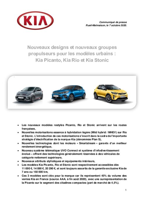 Les nouveaux modèles restylés Picanto, Rio et Stonic arrivent sur les routes françaises avec de nouvelles motorisations essence à hybridation légère (Mild hybrid / MHEV) sosur Rio et Stonic. L’introduction de ces motorisations s’inscrit dans le cadre de l’importante stratégie d’électrification de la marque Kia (dénommée Plan S)...