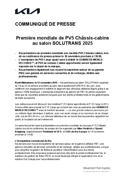 Kia participera au salon SOLUTRANS organisé du 18 au 22 novembre au parc des expositions EUREXPO de Lyon, pour réaffirmer son engagement à redéfinir le segment des véhicules utilitaires légers grâce à sa gamme 100% électrique. L’entreprise présentera sa gamme de PBV en pleine expansion ainsi que de nouvelles solutions conçues pour les clients professionnels et les gestionnaires de flotte européens.