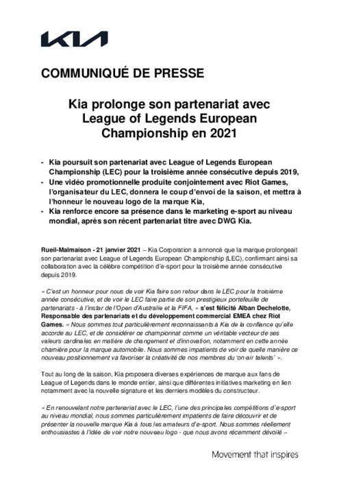 Kia Corporation a annoncé que la marque prolongeait son partenariat avec League of Legends European Championship (LEC), confirmant ainsi sa collaboration avec la célèbre compétition d’e-sport pour la troisième année consécutive depuis 2019.