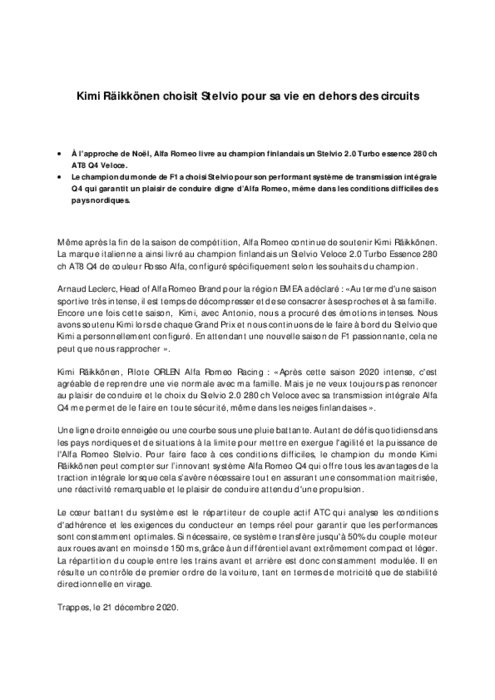 À l'approche de Noël, Alfa Romeo livre au champion finlandais un Stelvio 2.0 Turbo essence 280 ch AT8 Q4 Veloce. Le champion du monde de F1 a choisi Stelvio pour son performant système de transmission intégrale Q4 qui garantit un plaisir de conduire digne d’Alfa Romeo, même dans les conditions difficiles des pays nordiques.