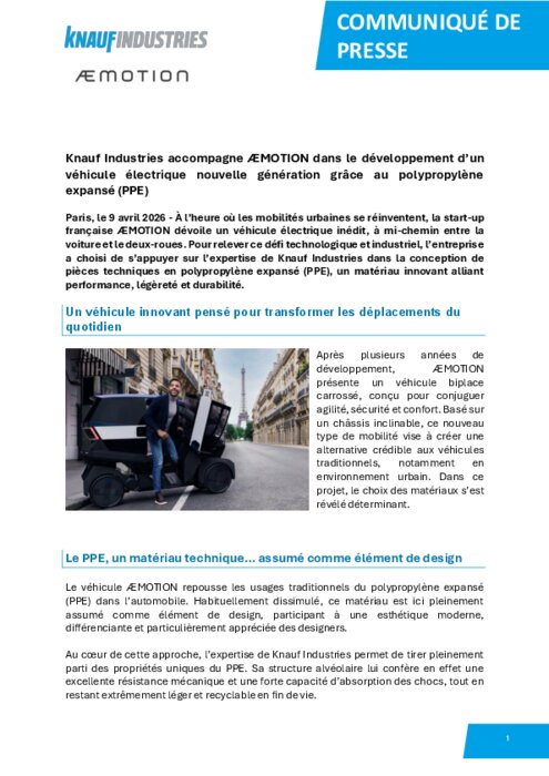 A l’heure où les mobilités urbaines se réinventent, la start-up française ÆMOTION dévoile un véhicule électrique inédit, à mi-chemin entre la voiture et le deux-roues. Pour relever ce défi technologique et industriel, l’entreprise a choisi de s’appuyer sur l’expertise de Knauf Industries dans la conception de pièces techniques en polypropylène expansé (PPE), un matériau innovant alliant performance, légèreté et durabilité.