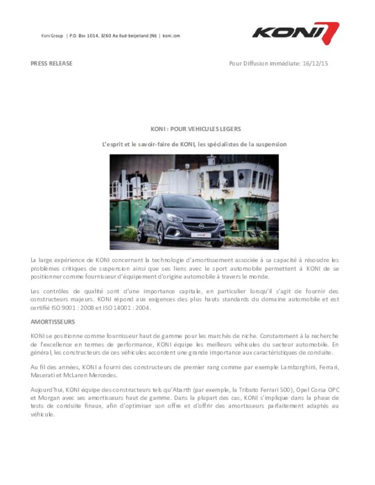 La large expérience de KONI concernant la technologie d’amortissement associée à sa capacité à résoudre les problèmes critiques de suspension ainsi que ses liens avec le sport automobile permettent à KONI de se positionner comme fournisseur d’équipement d’origine automobile à travers le monde.