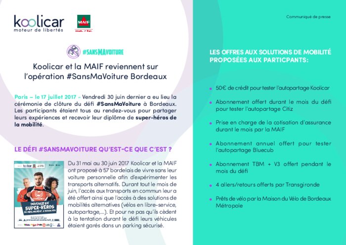 Services 17 juillet 2017 - 14:14 Vendredi 30 juin dernier a eu lieu la cérémonie de clôture du défi #SansMaVoiture à Bordeaux. Les participants étaient tous au rendez-vous pour partager leurs expériences et recevoir leur diplôme de super-héros de la mobilité. PDF (434 Ko) Télécharger