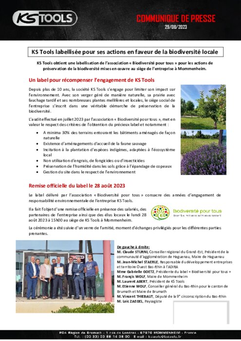 Equipementiers 11 septembre 2023 - 17:11 KS Tools obtient une labellisation de l’association « Biodiversité pour tous » pour les actions de préservation de la biodiversité mises en œuvre au siège de l’entreprise à Mommenheim. PDF (445 Ko) Télécharger