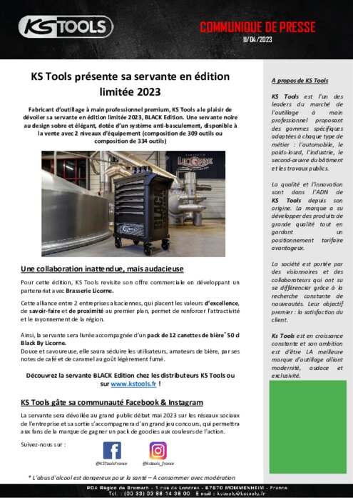 Fabricant d’outillage à main professionnel premium, KS Tools a le plaisir de dévoiler sa servante en édition limitée 2023, BLACK Edition. Une servante noire au design sobre et élégant, dotée d’un système anti-basculement, disponible à la vente avec 2 niveaux d’équipement (composition de 309 outils ou composition de 334 outils).