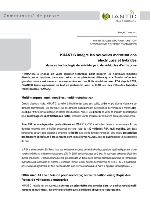 Kuantic a engagé un vaste chantier technique pour intégrer les nouveaux modèles électriques et hydrides dans son boîtier et sa plateforme télématique. Tandis qu’un test grandeur nature est mené en avant-première sur une flotte électrique avec PSA depuis 2020, KUANTIC lance également un test en partenariat avec la DIAC sur des véhicules hybrides rechargeables RENAULT.