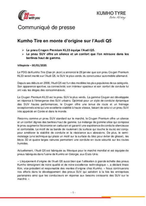 Le PDG de Kumho Tire (Dae-jin Jeon) a annoncé le 29 janvier que son pneu Crugen Premium KL33 serait monté sur l’Audi Q5, le SUV le plus vendu du constructeur automobile allemand. Depuis ses débuts en 2008, l'Audi Q5 est l'un des modèles les plus populaires de sa catégorie. Son apparence sportive, sa connectivité, son intérieur spacieux et son confort de conduite lui ont valu les éloges des consommateurs.