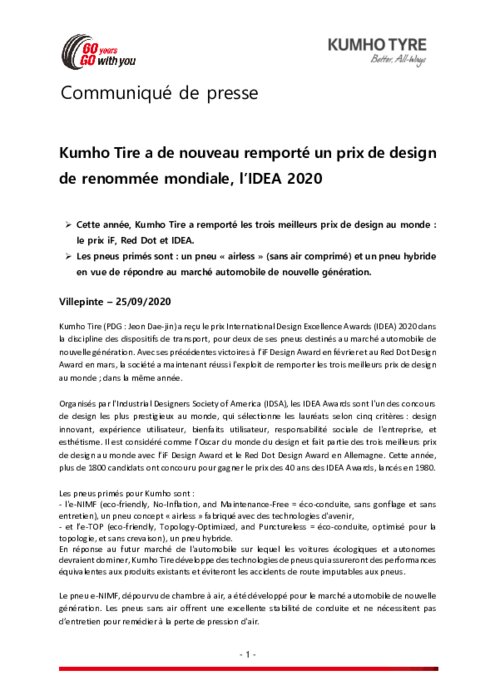 Kumho Tire a reçu le prix International Design Excellence Awards (IDEA) 2020 dans la discipline des dispositifs de transport, pour deux de ses pneus destinés au marché automobile de nouvelle génération. Avec ses précédentes victoires à l’iF Design Award en février et au Red Dot Design Award en mars, la société a maintenant réussi l'exploit de remporter les trois meilleurs prix de design au monde ; dans la même année.