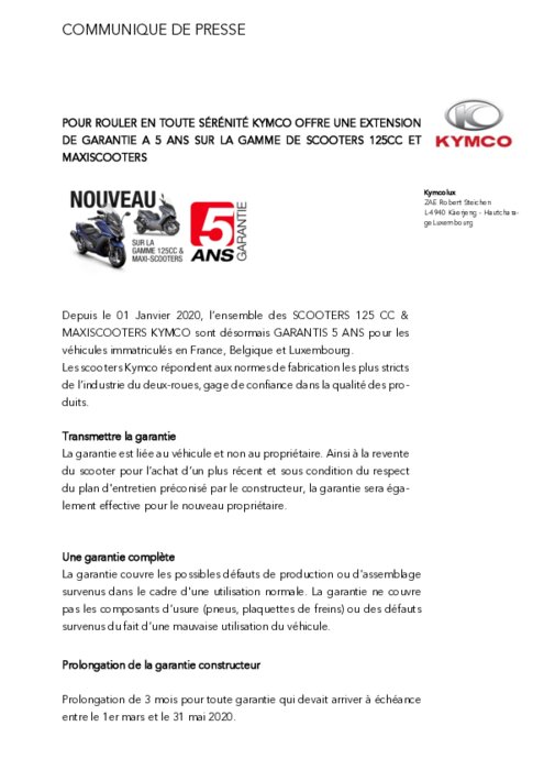 Depuis le 01 Janvier 2020, l’ensemble des SCOOTERS 125 CC & MAXISCOOTERS KYMCO sont désormais GARANTIS 5 ANS pour les véhicules immatriculés en France, Belgique et Luxembourg. Les scooters Kymco répondent aux normes de fabrication les plus stricts de l’industrie du deux-roues, gage de confiance dans la qualité des produits.