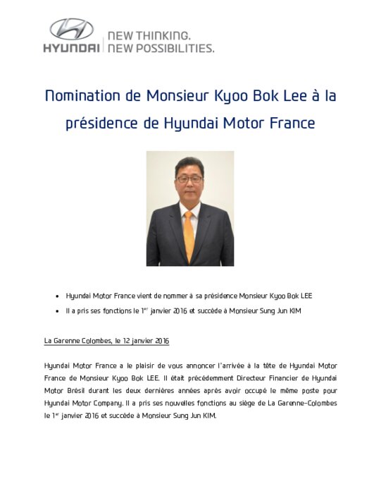 Hyundai France a le plaisir de vous annoncer l’arrivée à la tête de Hyundai France de Monsieur Kyoo Bok LEE. Il était précédemment Directeur Financier de Hyundai Motor Brésil durant les deux dernières années après avoir occupé le même poste pour Hyundai Motor Company. Il a pris ses nouvelles fonctions au siège de La Garenne-Colombes le 1er janvier 2016 et succède à Monsieur Sung Jun KIM.