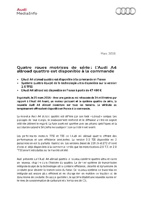 Avec une garde au sol rehaussée de 34 millimètres par rapport à l’Audi A4 Avant, un moteur puissant et le système quattro de série, la nouvelle Audi A4 allroad s’aventure sur tous les terrains. Le véhicule au tempérament offroad est disponible en France à la commande.