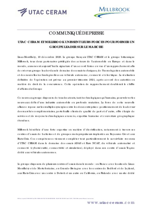 Quelques semaines après l'arrivée d'Eurazeo au capital de l'Utac-Ceram, la société a établi un "accord ferme en vue d'un rapprochement" avec Millbrook, propriété du groupe d'instrumentation britannique Spectris.