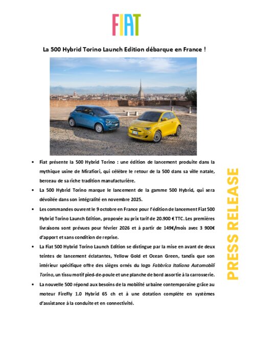 Fiat présente la 500 Hybrid Torino : une édition de lancement produite dans la mythique usine de Mirafiori, qui célèbre le retour de la 500 dans sa ville natale, berceau de sa riche tradition manufacturière. La 500 Hybrid Torino marque le lancement de la gamme 500 Hybrid, qui sera dévoilée dans son intégralité en novembre 2025.