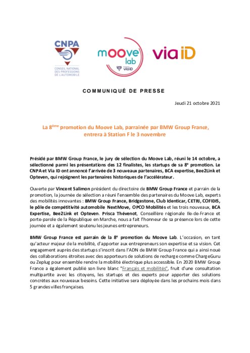 Présidé par BMW Group France, le jury de sélection du Moove Lab, réuni le 14 octobre, a sélectionné parmi les présentations des 12 finalistes, les startups de sa 8e promotion. Le CNPA et Via ID ont annoncé l’arrivée de 3 nouveaux partenaires, BCA expertise, Bee2Link et Opteven, qui rejoignent les partenaires historiques de l’accélérateur.