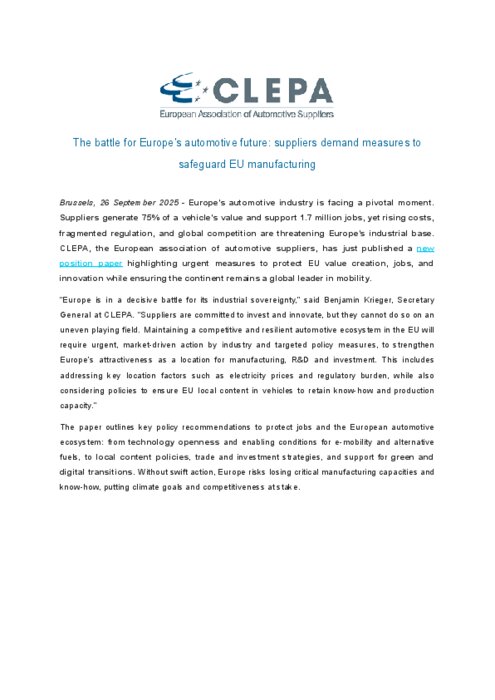 L'industrie automobile européenne se trouve à un tournant décisif. Les équipementiers génèrent 75 % de la valeur d'un véhicule et soutiennent 1,7 million d'emplois, mais la hausse des coûts, la fragmentation de la réglementation et la concurrence mondiale menacent la base industrielle européenne. La CLEPA, l'association européenne des équipementiers automobiles, vient de publier un nouveau document de synthèse soulignant les mesures urgentes à prendre pour protéger la création de valeur, les emplois et l'innovation dans l'UE, tout en veillant à ce que le continent reste un leader mondial dans le domaine de la mobilité.