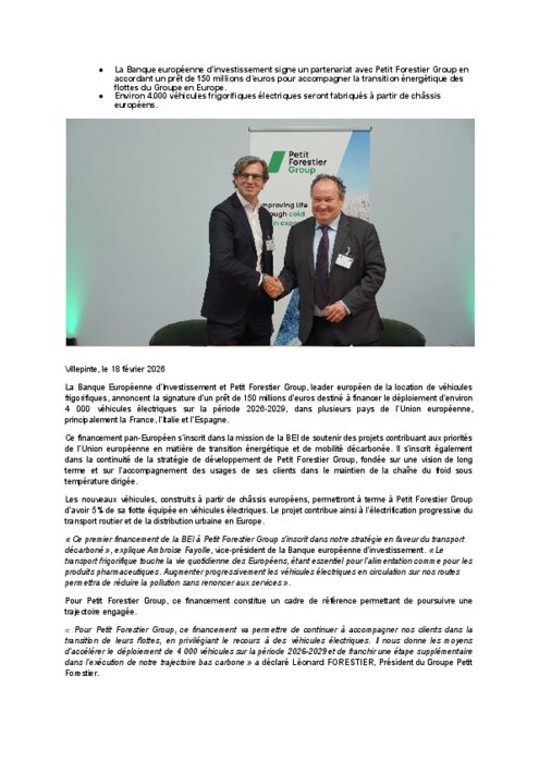 La Banque Européenne d’Investissement et Petit Forestier Group, leader européen de la location de véhicules frigorifiques, annoncent la signature d’un prêt de 150 millions d’euros destiné à financer le déploiement d’environ 4 000 véhicules électriques sur la période 2026-2029, dans plusieurs pays de l’Union européenne, principalement la France, l’Italie et l’Espagne.