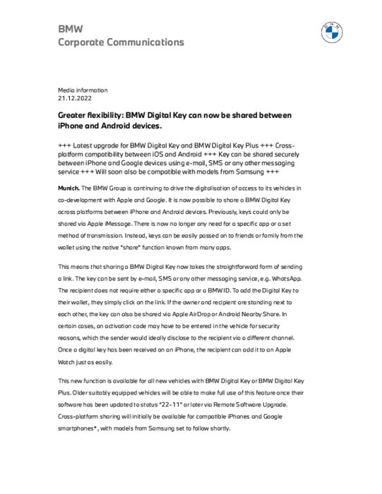 BMW Group poursuit la digitalisation de l'accès à ses véhicules en co-développement avec Apple et Google. Il est désormais possible de partager une BMW Digital Key sur plusieurs plateformes entre des appareils iPhone et Android. Auparavant, les clés ne pouvaient être partagées que via Apple iMessage. Il n'est désormais plus nécessaire de recourir à une application spécifique ou à une méthode de transmission déterminée.