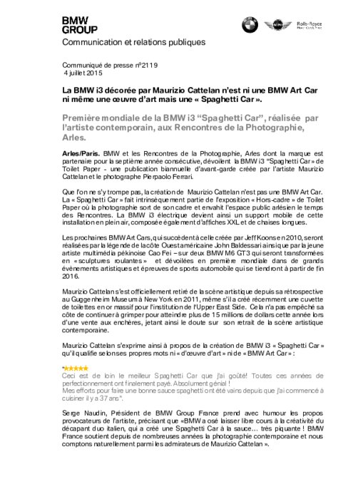 BMW et les Rencontres de la Photographie, Arles dont la marque est partenaire pour la septième année consécutive, dévoilent la BMW i3 " Spaghetti Car " de Toilet Paper - une publication biannuelle d’avant-garde créée par l’artiste Maurizio Cattelan et le photographe Pierpaolo Ferrari.