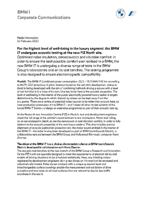 Isolation acoustique, aéroacoustique et confort vibratoire optimisés : afin de garantir le meilleur confort jamais obtenu dans une BMW, la nouvelle BMW i7 est soumise à une série de tests variés dans les laboratoires et sur les bancs d'essai de BMW Group. Le programme d'essais est également conçu pour garantir la compatibilité électromagnétique...