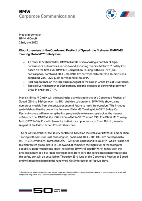 BMW M GmbH concentrera ses activités sur les célébrations de son 50e anniversaire lors du Goodwood FOS. BMW M présentera de nombreux modèles historiques, actuels et futurs pour marquer l'occasion. Cela inclut des premières mondiales comme celle de la toute première BMW M3 Touring MotoGP™ Safety Car. Les visiteurs du festival seront parmi les premières personnes à pouvoir observer de près la toute nouvelle safety car de BMW M...
