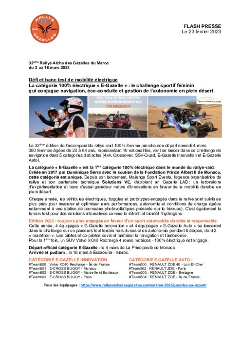 La 32ème édition de l’incomparable rallye-raid 100% féminin prendra son départ samedi 4 mars. 380 femmes âgées de 20 à 64 ans, représentant 10 nationalités, vont se lancer dans ce challenge de navigation dans 5 catégories distinctes (4x4, Crossover, SSV-Quad, E-Gazelle Innovation et E-Gazelle Auto).