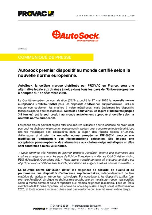 Equipementiers 30 septembre 2020 - 16:16 AutoSock, la célèbre marque distribuée par PROVAC en France, sera une alternative légale aux chaînes à neige dans tous les pays de l'Union européenne à compter du 1er décembre 2020. PDF (4 Mo) Télécharger