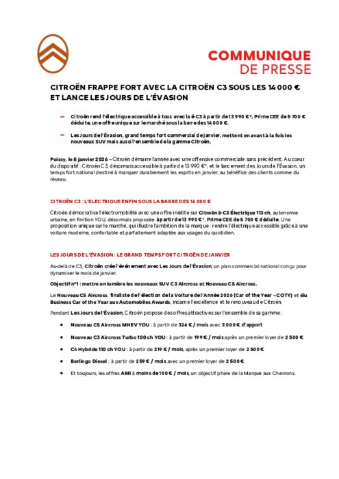 Citroën démarre l’année avec une offensive commerciale sans précédent. Au cœur du dispositif : Citroën C3, désormais accessible à partir de 13 990 €*, et le lancement des Jours de l’Évasion, un temps fort national destiné à marquer durablement les esprits en janvier, au bénéfice des clients comme du réseau.
