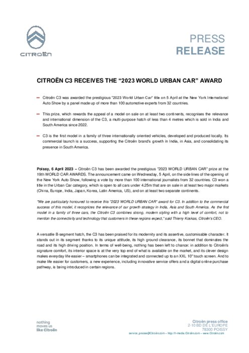 Ce prix, qui récompense l'attractivité d'un modèle commercialisé sur au moins deux continents, reconnaît la pertinence et la dimension internationale de la C3, une voiture polyvalente de moins de 4 mètres vendue en Inde et en Amérique du Sud depuis 2022.