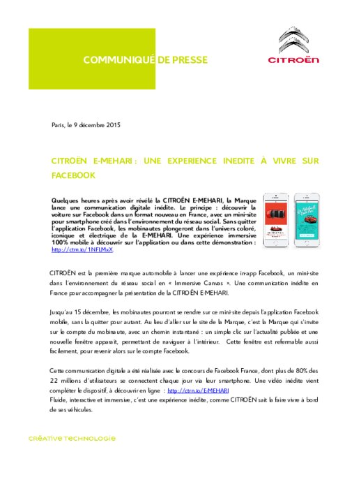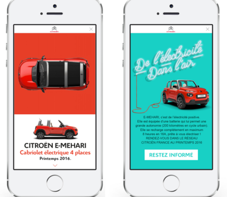Quelques heures après avoir révélé la CITROËN E-MEHARI, la Marque lance une communication digitale inédite. Le principe : découvrir la voiture sur Facebook dans un format nouveau en France, avec un mini-site pour smartphone créé dans l’environnement du réseau social. Sans quitter l'application Facebook, les mobinautes plongeront dans l’univers coloré, iconique et électrique de la E-MEHARI. Une expérience immersive 100% mobile à découvrir sur l’application.