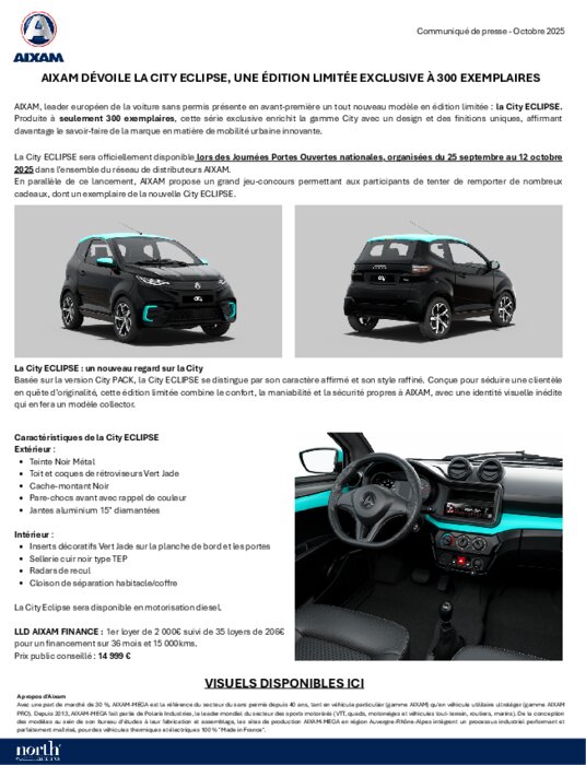 Aixam, leader européen de la voiture sans permis présente en avant-première un tout nouveau modèle en édition limitée : la City Eclipse. Produite à seulement 300 exemplaires, cette série exclusive enrichit la gamme City avec un design et des finitions uniques, affirmant davantage le savoir-faire de la marque en matière de mobilité urbaine innovante.