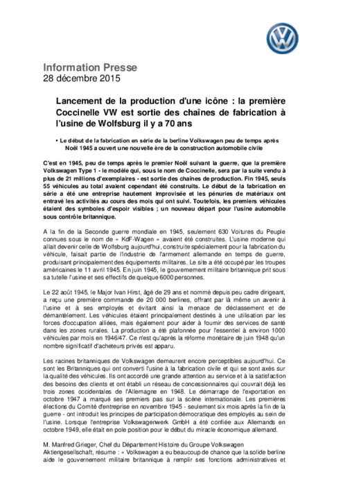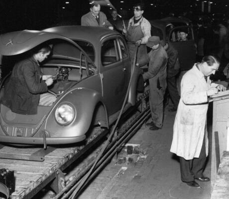 Le début de la fabrication en série de la berline Volkswagen peu de temps après Noël 1945 a ouvert une nouvelle ère de la construction automobile civile. C’est en 1945, peu de temps après le premier Noël suivant la guerre, que la première Volkswagen Type 1 – le modèle qui, sous le nom de Coccinelle, sera par la suite vendu à plus de 21 millions d’exemplaires – est sortie des chaînes de production. Fin 1945, seuls 55 véhicules au total avaient cependant été construits.