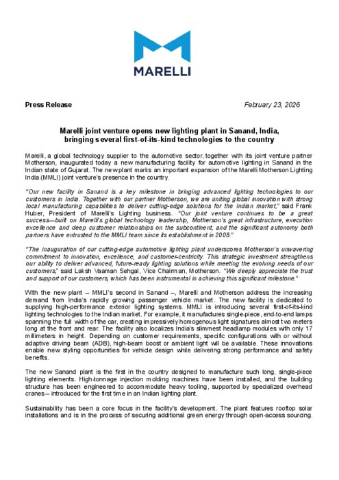 Marelli, fournisseur mondial de technologies pour le secteur automobile, a inauguré aujourd'hui, en collaboration avec son partenaire de coentreprise Motherson, une nouvelle usine de fabrication de systèmes d'éclairage automobile à Sanand, dans l'État indien du Gujarat. Cette nouvelle usine marque une expansion importante de la présence de la coentreprise Marelli Motherson Lighting India (MMLI) dans le pays.