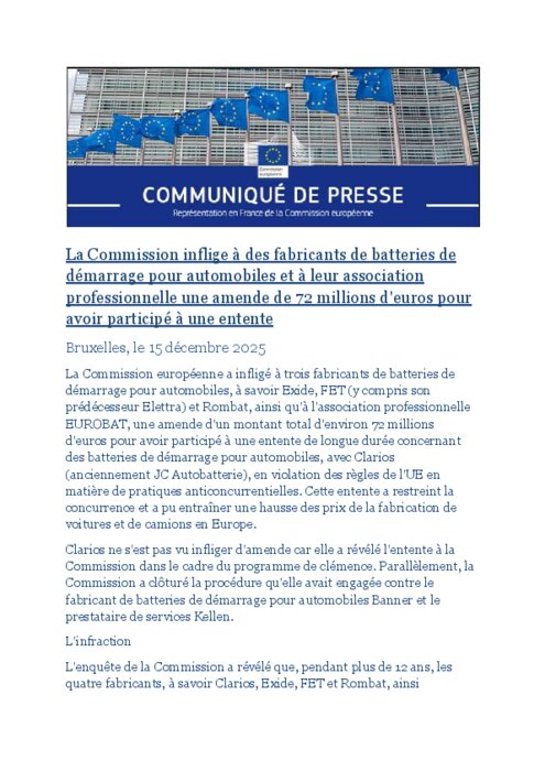 La Commission européenne a infligé à trois fabricants de batteries de démarrage pour automobiles, à savoir Exide, FET(y compris son prédécesseur Elettra) et Rombat, ainsi qu'à l'association professionnelle EUROBAT, une amende d'un montant total d'environ 72 millions d'euros pour avoir participé à une entente de longue durée concernant des batteries de démarrage pour automobiles, avec Clarios(anciennement JC Autobatterie), en violation des règles de l'UE en matière de pratiques anticoncurrentielles. Cette entente a restreint la concurrence et a pu entraîner une hausse des prix de la fabrication de voitures et de camions en Europe.