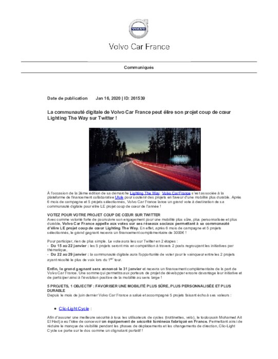 À l’occasion de la 2ème édition de sa démarche Lighting The Way, Volvo Car France s’est associée à la plateforme de financement collaborative Ulule pour soutenir des projets en faveur d’une mobilité plus durable. Après 6 mois de campagne et 5 projets sélectionnés, Volvo Car France lance un grand vote à destination de sa communauté digitale pour élire LE projet coup de cœur de l’année !