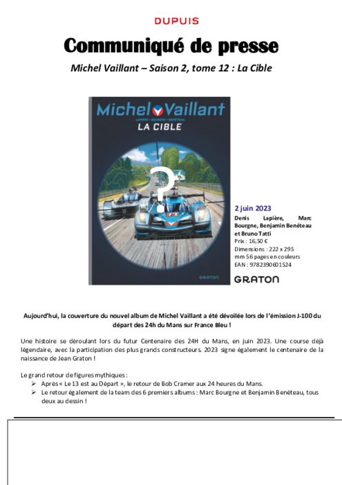 Services 02 mars 2023 - 19:05 Une histoire se déroulant lors du futur Centenaire des 24H du Mans, en juin 2023. Une course déjà légendaire, avec la participation des plus grands constructeurs. PDF (341 Ko) Télécharger