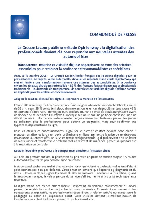 Le Groupe Lacour, leader français des solutions digitales pour les professionnels de l’après-vente automobile, dévoile les résultats d’une étude OpinionWay qui met en lumière une transformation majeure des attentes des automobilistes. Si la confiance envers les réseaux physiques reste solide – 89 % des Français font confiance aux professionnels traditionnels – la demande de transparence, de contrôle et de visibilité digitale s’affirme comme un impératif pour les ateliers et concessionnaires.