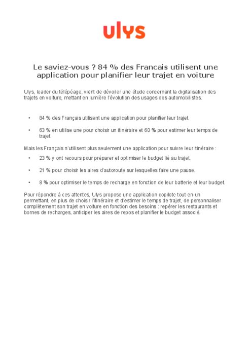 Pour répondre à ces attentes, Ulys propose une application copilote tout-en-un permettant, en plus de choisir l'itinéraire et d'estimer le temps de trajet, de personnaliser complètement son trajet en voiture en fonction des besoins : repérer les restaurants et bornes de recharges, anticiper les aires de repos et planifier le budget associé.
