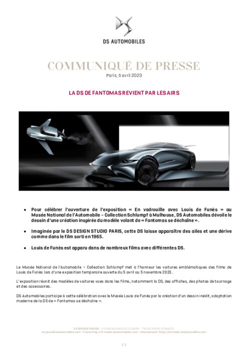 Pour célébrer l’ouverture de l’exposition « En vadrouille avec Louis de Funès » au Musée National de l’Automobile – Collection Schlumpf à Mulhouse, DS Automobiles dévoile le dessin d’une création inspirée du modèle volant de « Fantomas se déchaîne ». Imaginée par le DS DESIGN STUDIO PARIS, cette DS laisse apparaître des ailes et une dérive comme dans le film sorti en 1965.