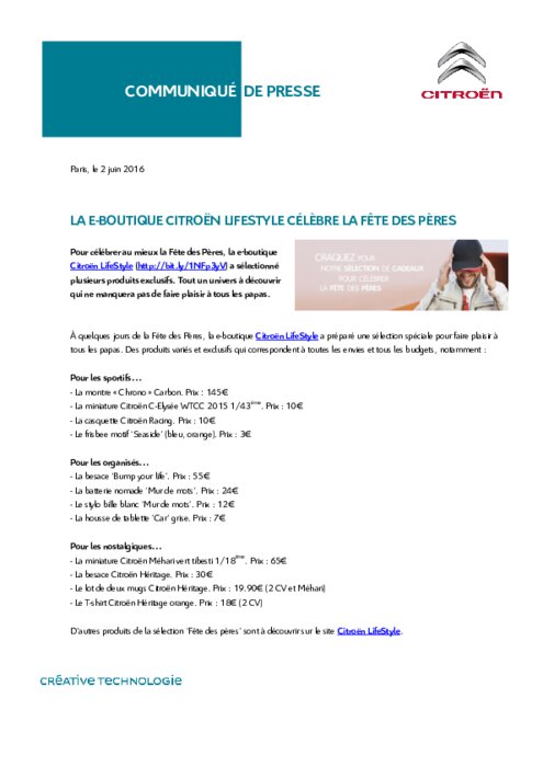 Constructeurs 01 juin 2016 - 11:18 Pour célébrer au mieux la Fête des Pères, la e-boutique Citroën LifeStyle (http://bit.ly/1NFp3yV) a sélectionné plusieurs produits exclusifs. Tout un univers à découvrir qui ne manquera pas de faire plaisir à tous les papas. PDF (74 Ko) Télécharger