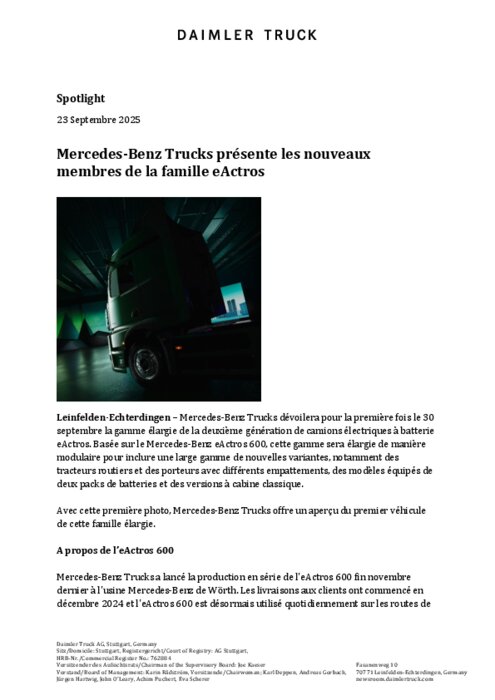 Mercedes-Benz Trucks dévoilera pour la première fois le 30 septembre la gamme élargie de la deuxième génération de camions électriques à batterie eActros. Basée sur le Mercedes-Benz eActros 600, cette gamme sera élargie de manière modulaire pour inclure une large gamme de nouvelles variantes, notamment des tracteurs routiers et des porteurs avec différents empattements, des modèles équipés de deux packs de batteries et des versions à cabine classique.