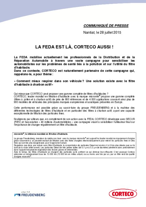 La FEDA mobilise actuellement les professionnels de la distribution et de la réparation automobile à travers une vaste campagne pour sensibiliser les automobilistes sur les problèmes de santé liés à la pollution et sur l’utilité du filtre d’habitacle. Dans ce contexte, CORTECO est naturellement partenaire de cette campagne qui, rappelons-le, a pour thème : " Comment mieux respirer dans son véhicule ? Une solution existe avec le filtre d’habitacle à charbon actif " .