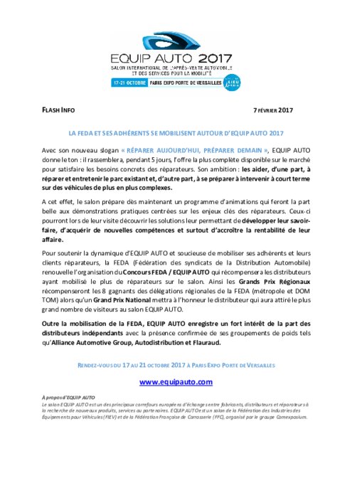 Pour soutenir la dynamique d’EQUIP AUTO et soucieuse de mobiliser ses adhérents et leurs clients réparateurs, la FEDA (Fédération des syndicats de la Distribution Automobile) renouvelle l’organisation du Concours FEDA / EQUIP AUTO qui récompensera les distributeurs ayant mobilisé le plus de réparateurs sur le salon.