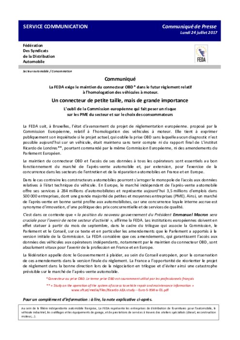 La FEDA exige le maintien du connecteur OBD dans le futur règlement relatif à l’homologation des véhicules à moteur. La fédération appelle donc le Gouvernement à plaider, au sein du Conseil européen, pour la conservation de ces amendements dans la version finale du règlement. La France a l'opportunité de réorienter le projet de règlement dans la bonne direction lors de la négociation en trilogue et d'éviter ainsi une catastrophe prévisible sur le marché de l'après-vente automobile.