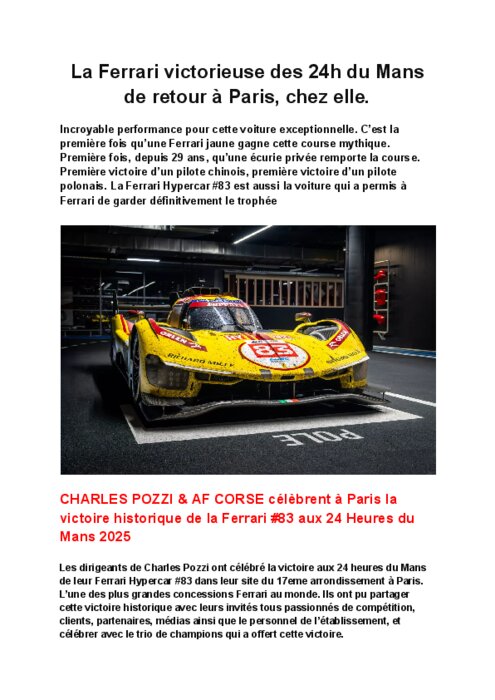 Incroyable performance pour cette voiture exceptionnelle. C’est la première fois qu’une Ferrari jaune gagne cette course mythique. Première fois, depuis 29 ans, qu’une écurie privée remporte la course. Première victoire d’un pilote chinois, première victoire d’un pilote polonais.