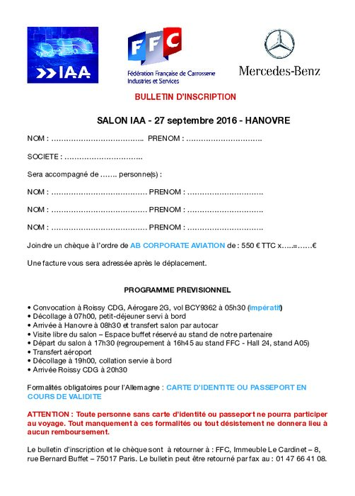 Comme à l'accoutumée, la FFC, en partenariat avec MERCEDES, organise pour ses adhérents une visite du salon international de Hanovre dans la journée du MARDI 27 SEPTEMBRE 2016. Au programme : un avion spécialement affrété pour l'occasion, des transferts assurés entre l'aéroport et le salon, l'espace convivial du stand FFC à votre disposition et un espace buffet réservé au coeur même du salon pour optimiser votre temps de visite.