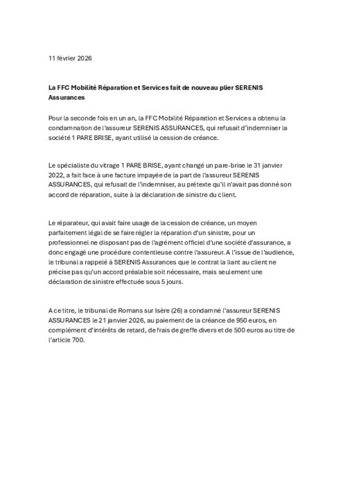 Réparateurs 12 février 2026 - 09:43 Pour la seconde fois en un an, la FFC Mobilité Réparation et Services a obtenu la condamnation de l’assureur SERENIS ASSURANCES, qui refusait d’indemniser la société 1 PARE BRISE, ayant utilisé la cession de créance. PDF (37 Ko) Télécharger credit FFC mobilité