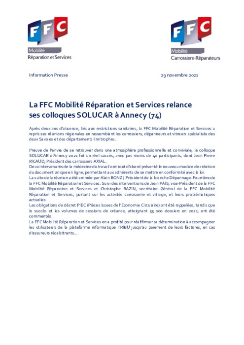 Après deux ans d’absence, liés aux restrictions sanitaires, la FFC Mobilité Réparation et Services a repris ses réunions régionales en rassemblant les carrossiers, dépanneurs et vitreurs spécialisés des deux Savoies et des départements limitrophes. Preuve de l'envie de se retrouver dans une atmosphère professionnelle et conviviale, le colloque SOLUCAR d'Annecy 2021 fut un réel succès, avec pas moins de 40 participants, dont Jean Pierre RICAUD, Président des carrossiers AXIAL.